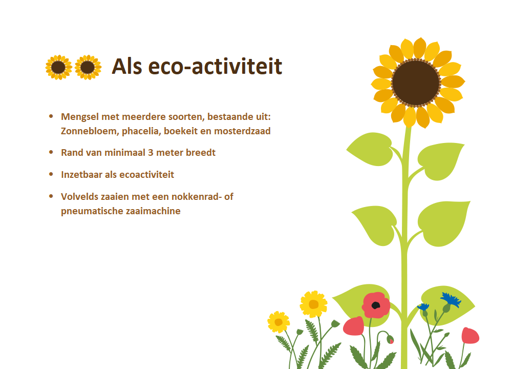 Als boer kunt u ook een bijdrage leveren aan de biodiversiteit. Er zijn twee opties: 1 STER: Vervang de buitenste 4 rijen van uw maĆÆs door zonnebloemen. 2 STERREN: Zaai een mengsel van meerdere bloeiende soorten in, zodat deze als eco-activiteit binnen het nieuwe gemeenschappelijke landbouwbeleid kan meetellen.