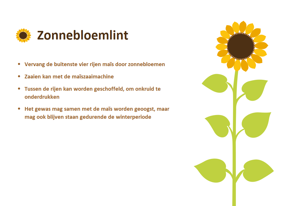 Het telen van zonnebloemen is door hun groeiwijze geschikt om (machinaal) te zaaien, te oogsten en te conserveren in combinatie met maĆÆs. Naast een positief effect op bijen heeft het ook een positief effect op andere insecten en vogels. Door te kiezen voor het telen van zonnebloemen levert de sector een bijdrage aan meer diversiteit in het landschap. Deze teelt gaat niet volledig ten koste van de voederwaarde van het maisperceel. De waarde van zonnebloemen als veevoer is relatief aantrekkelijk. Meer weten over telen van zonnebloemen. Lees hier het onderzoeksrapport of de teelthandleiding.